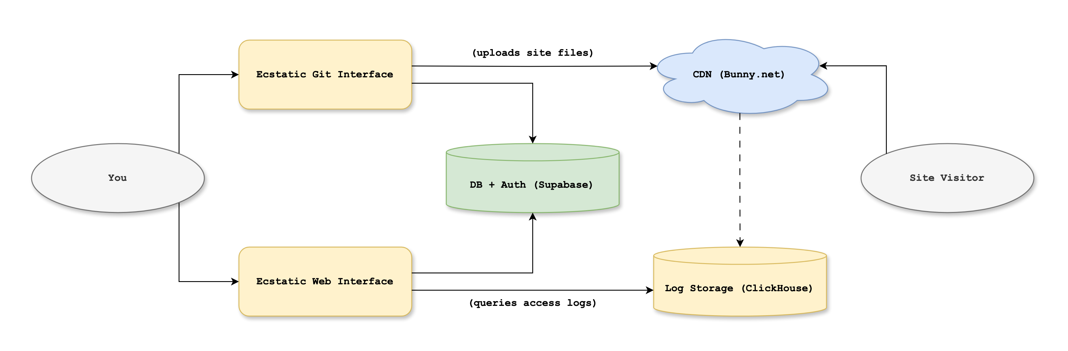 This design is the result of a lot of iteration, and I think it represents a "local maximum" in terms of ease of use and resilience. This is to say -- no part of Ecstatic going down will ever mean a visitor can't load an Ecstatic site, which is the most important thing.